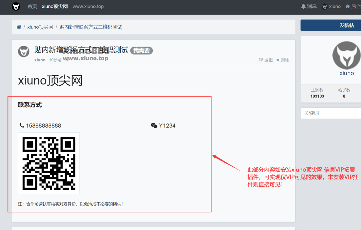此插件适合信息发布类网站使用,用户展示联系方式信息,联动VIP插件【xiuno支付宝微信开通VIP内容查看定制版V1.0】后还可以实现仅VIP可见联系方式的效果