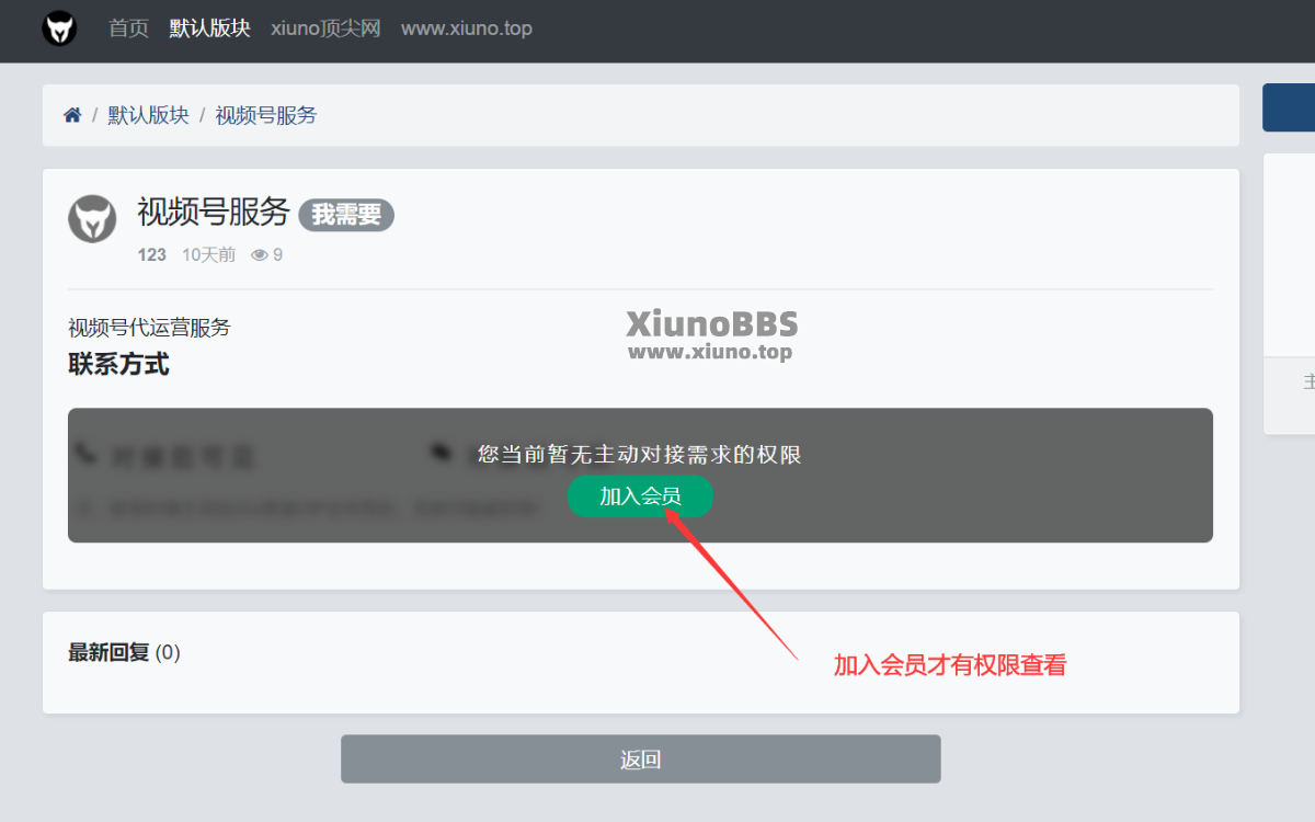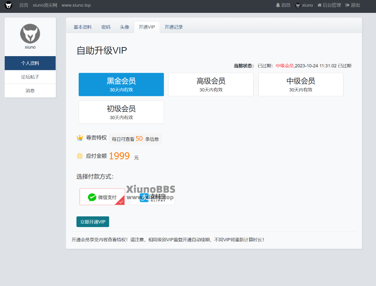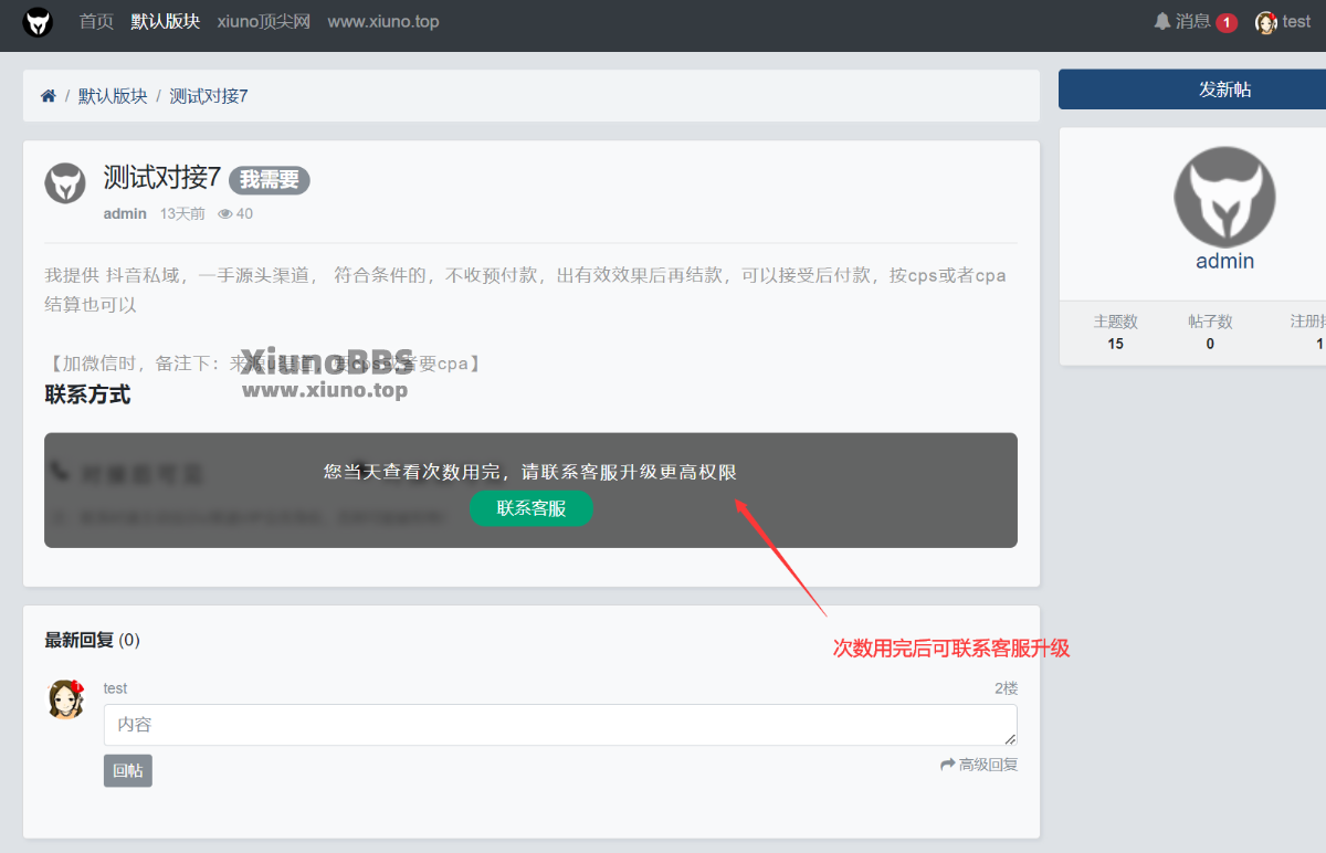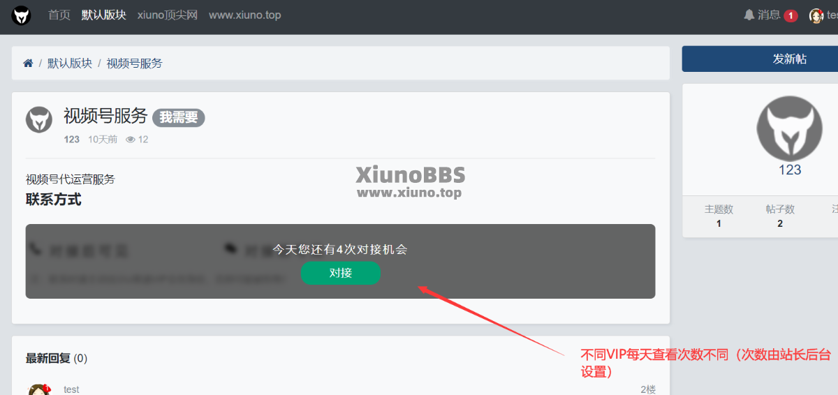 xiuno支付宝微信开通VIP内容查看定制版V1.0是一款内容VIP按次查看插件,需先安装【帖内联系方式补充展示V1.0】,可实现联系方式仅VIP可看,且不同等级的VIP每天可查看次数不同!主要用于付费信息展示型网站,比如本地生活、广告平台等等。