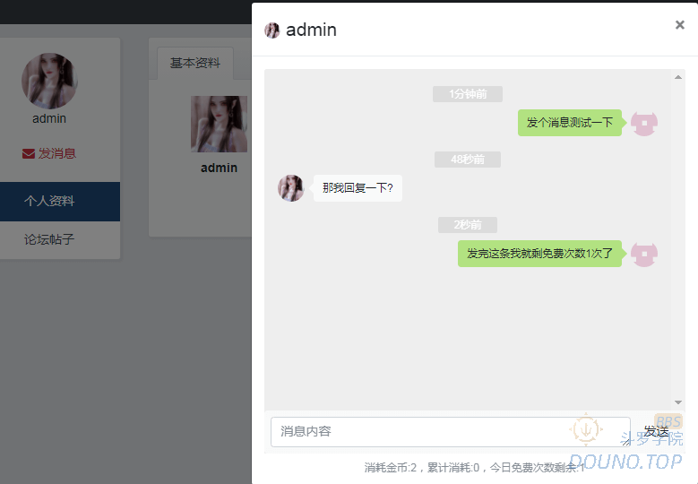 在原ax_notice_sx私信插件上做的升级改动增加聊天记录对话框展示,双方聊天记录都可以看到。增加每日免费发信次数,免费次数用完后需要扣除设置的积分才能发信。增加勾选的用户组发信扣费,未勾选则不扣费。